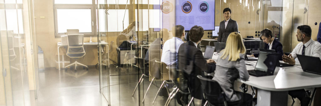 Date Taken: 24-Mar-2018 00:00:00 Credit: Getty Images Title: Business presentation in an office conference room Caption: Panoramic photo of people sitting at a conference table in an office and listening to a female presenter. Camera: NIKON D850 Focal Length: 35mm Aperture: f/1.4 ISO: 400 Shutter Speed: 1/350 second